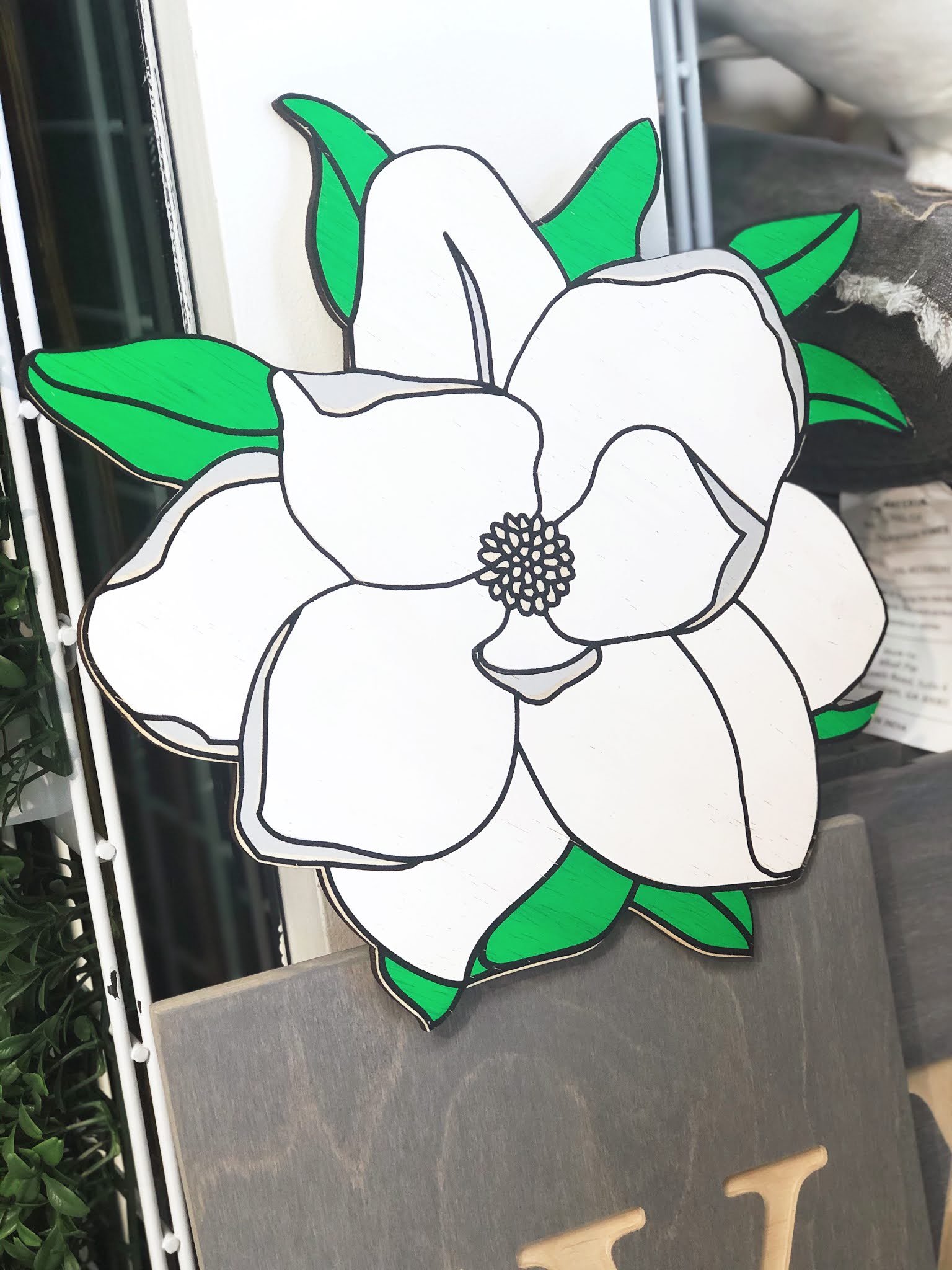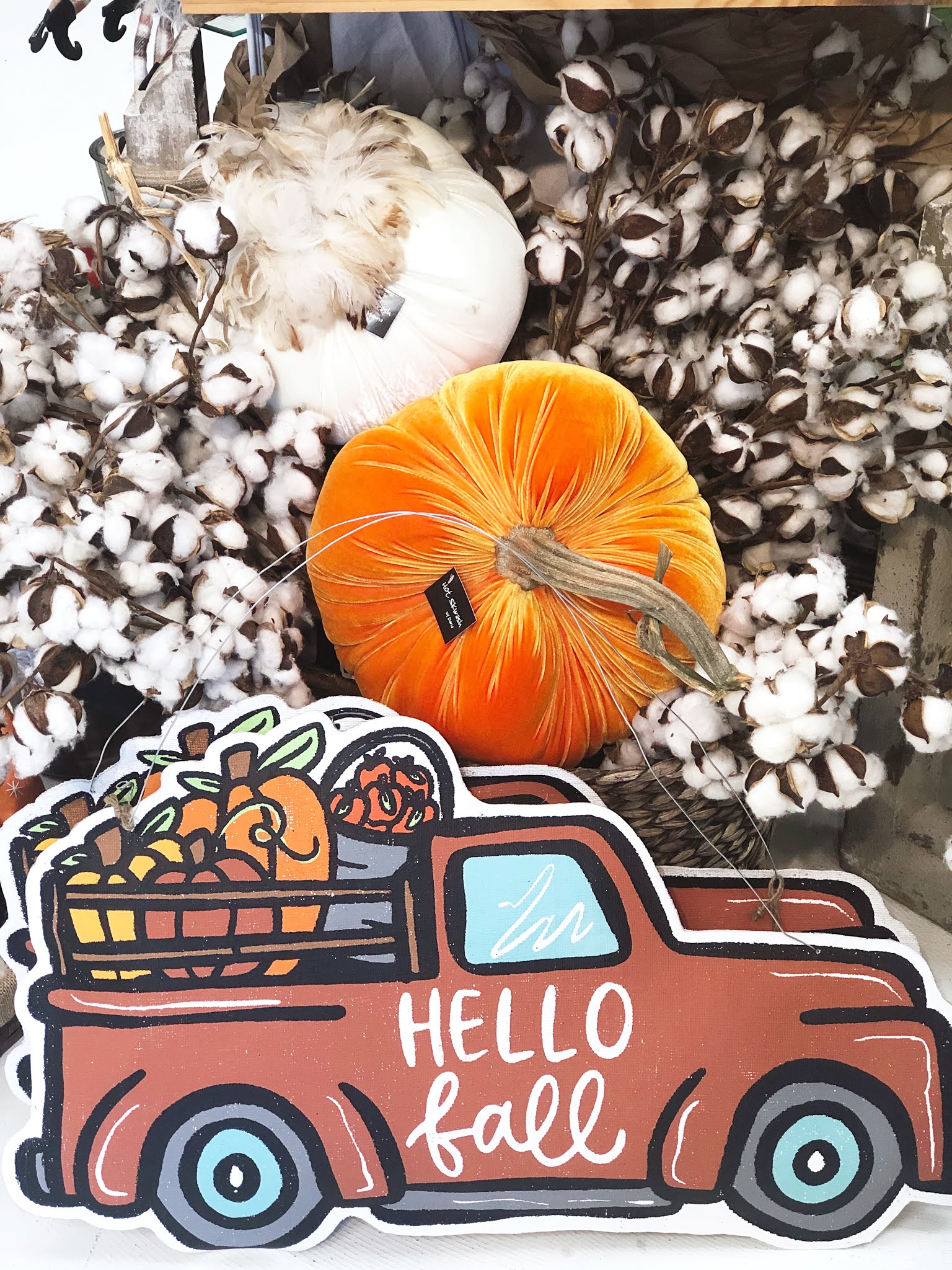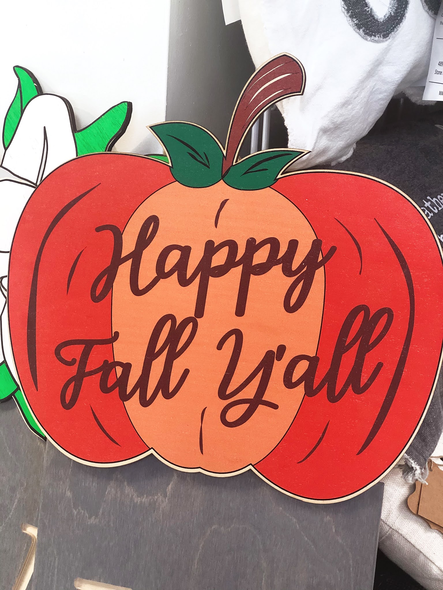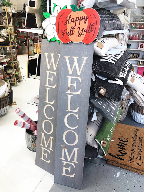 It can simply be a "welcome" sign, or it can be topped with a removable attachment. They had several options on hand but we are partial to the magnolia one (obviously) and the "Happy Fall Y'all" ones.