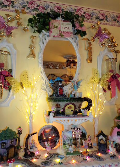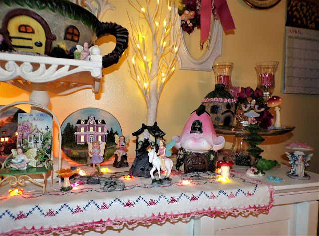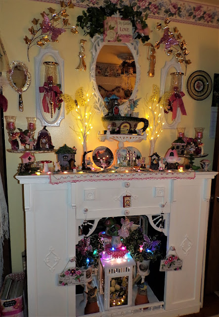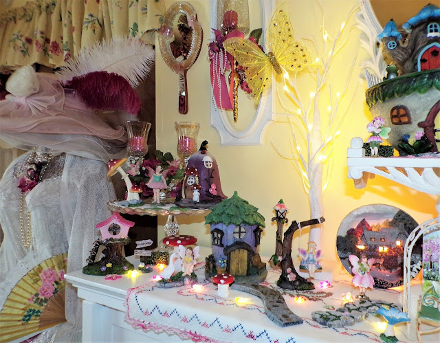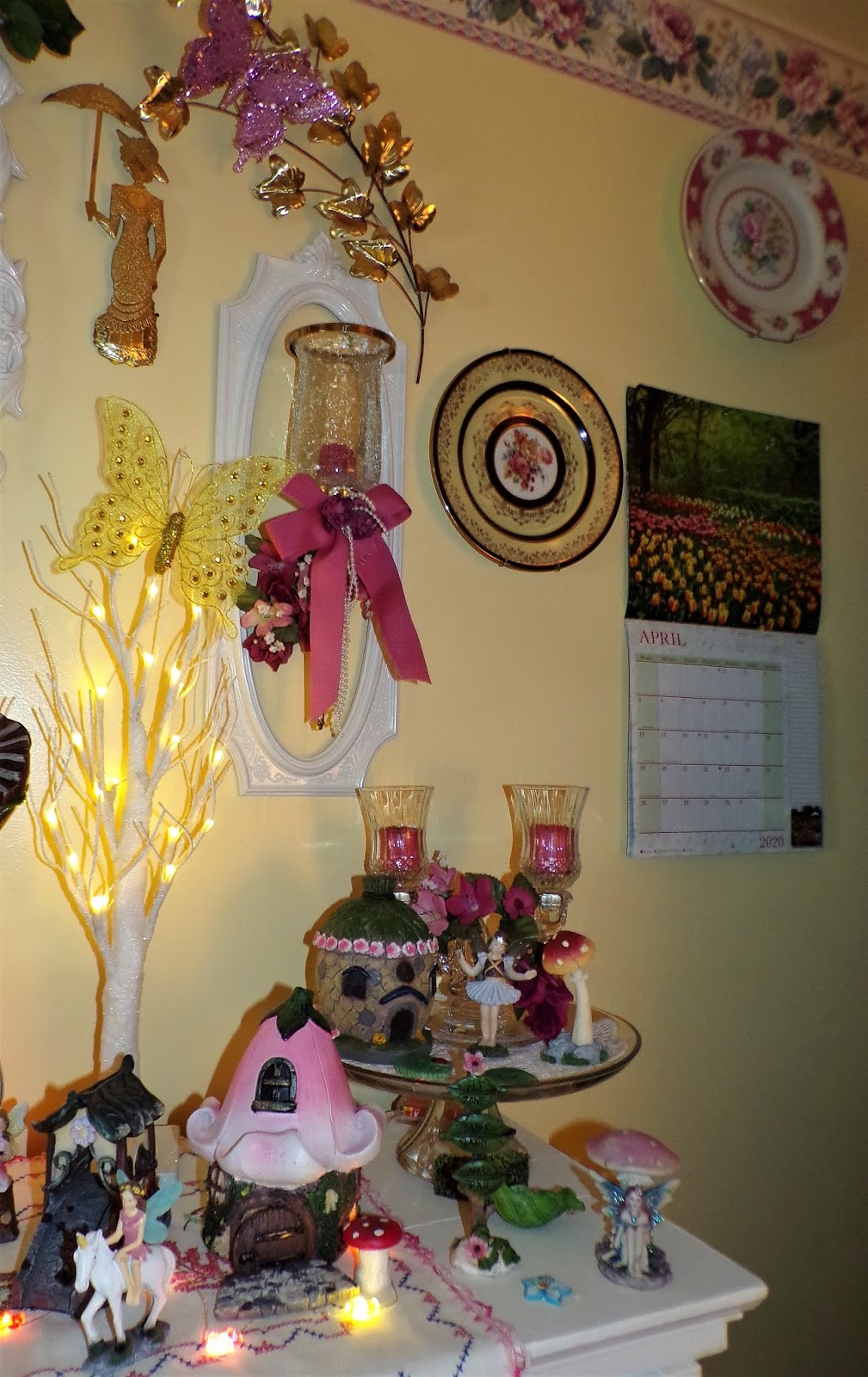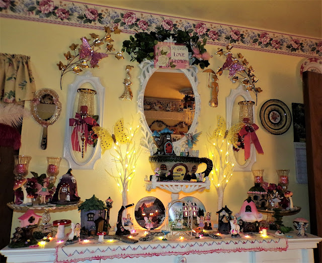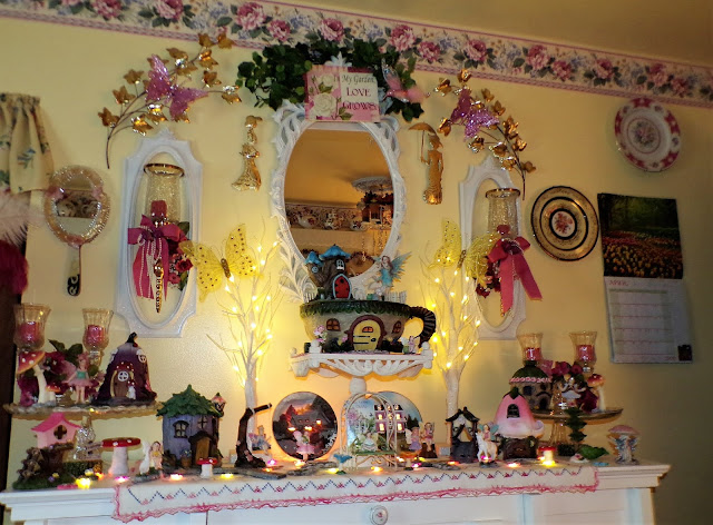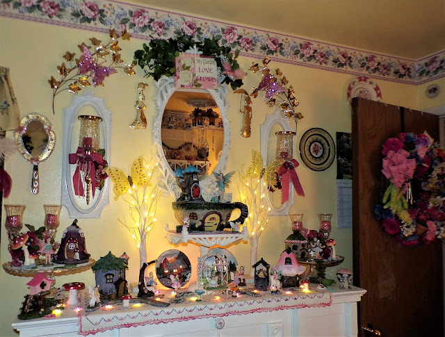 For a few years now, I have decorated the "mantel" with Fairy Garden pieces......