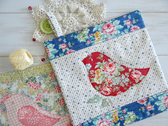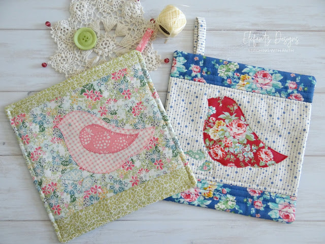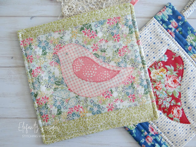 * adding the applique bird to the centre of a quilt block would be really nice and a good way to use up one or more orphan quilt blocks in your stash. These could become pot holders, cushion covers or if you sew a few of them pretty soon a nice lap quilt might be made!